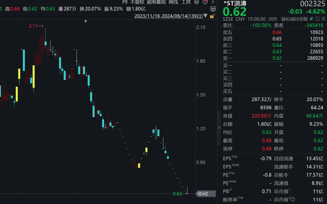 股价已连续10天低于1元/股的*ST洪涛(002325), 面值退市紧箍咒高悬在头顶。