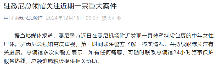 中国驻悉尼总领馆消息,据当地媒体报道,悉尼警方近日在悉尼机场附近发现一具被塑料袋包裹的中年女性尸体。驻悉尼总领馆高度重视,第一时间联系警方了解、核实情况,并持续跟踪关注有关进展。总领馆多次向警方表示,如有任何需要,可随时联系总领馆24小时领事保护服务热线,总领馆愿积极提供相关协助。