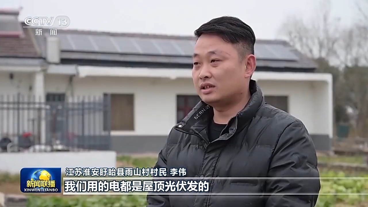 江苏淮安盱眙县雨山村村民 李伟:我们用的电都是屋顶光伏发的,不仅家里可以用,还能给电动汽车充电。绿色环保,还能带来收益。
